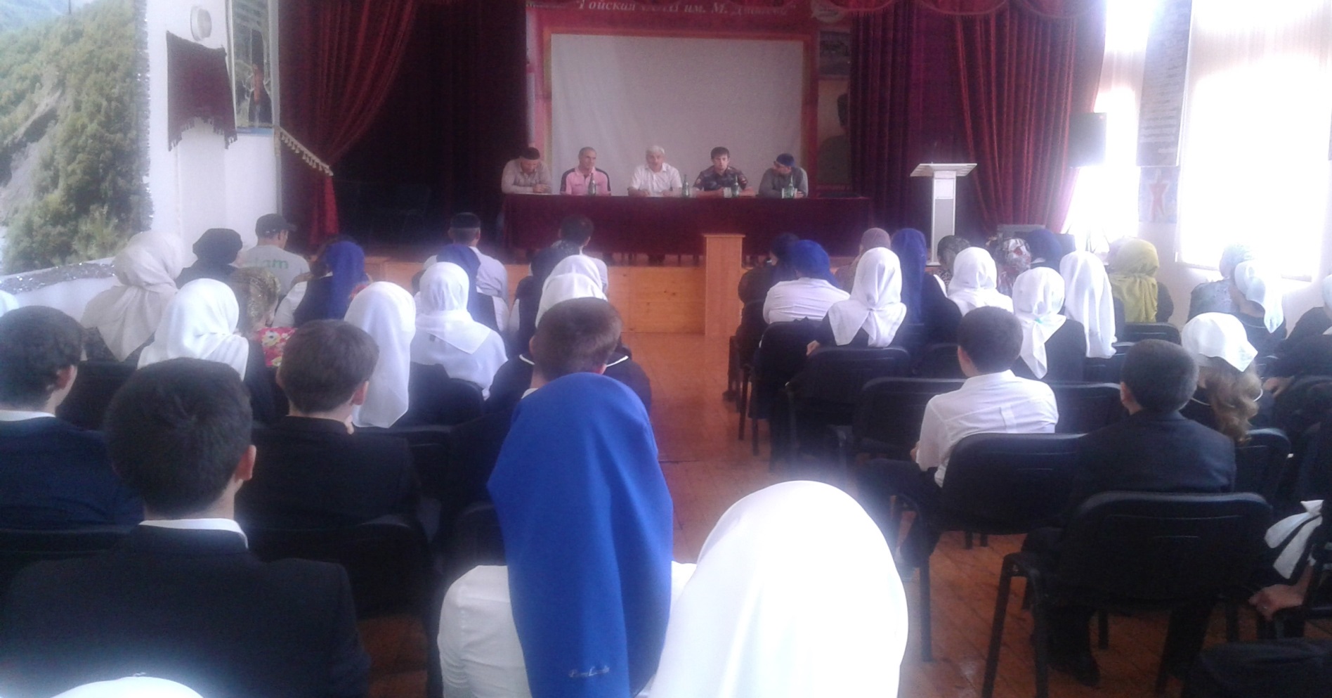 Общешкольное собрание с учащимися 8-11 классов с участием родителей на темы:1. Пагубность идеологии экстремистских течений. Профилактика ее воздействия.2. Этические нормы традиционного поведения чеченцев в быту и общественных местах.3. Развитие у подрастающего поколения способности противостоять алкоголю, наркотикам.